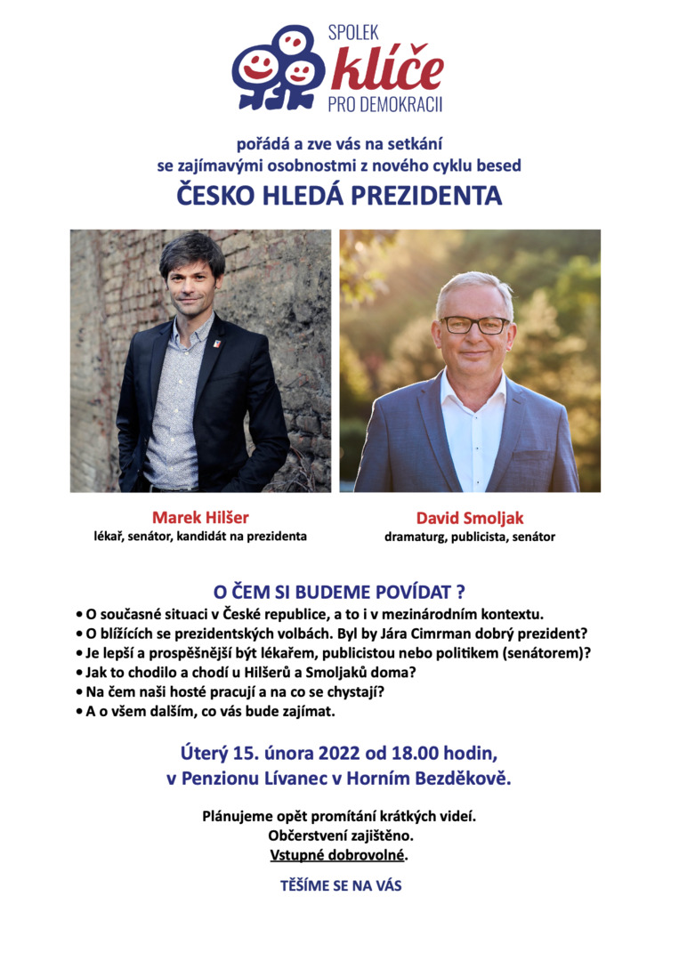 Debata s občany v Horním Bezděkově S potěšením jsem přijal pozvání na debatu s občany do Horního Bezděkova na téma "Česko hledá prezidenta". V debatě, kterou pořádal spolek Klíče pro demokracii, jsem vystoupil společně se senátorem Davidem Smoljakem. Galerie